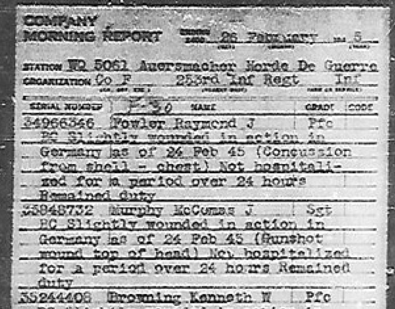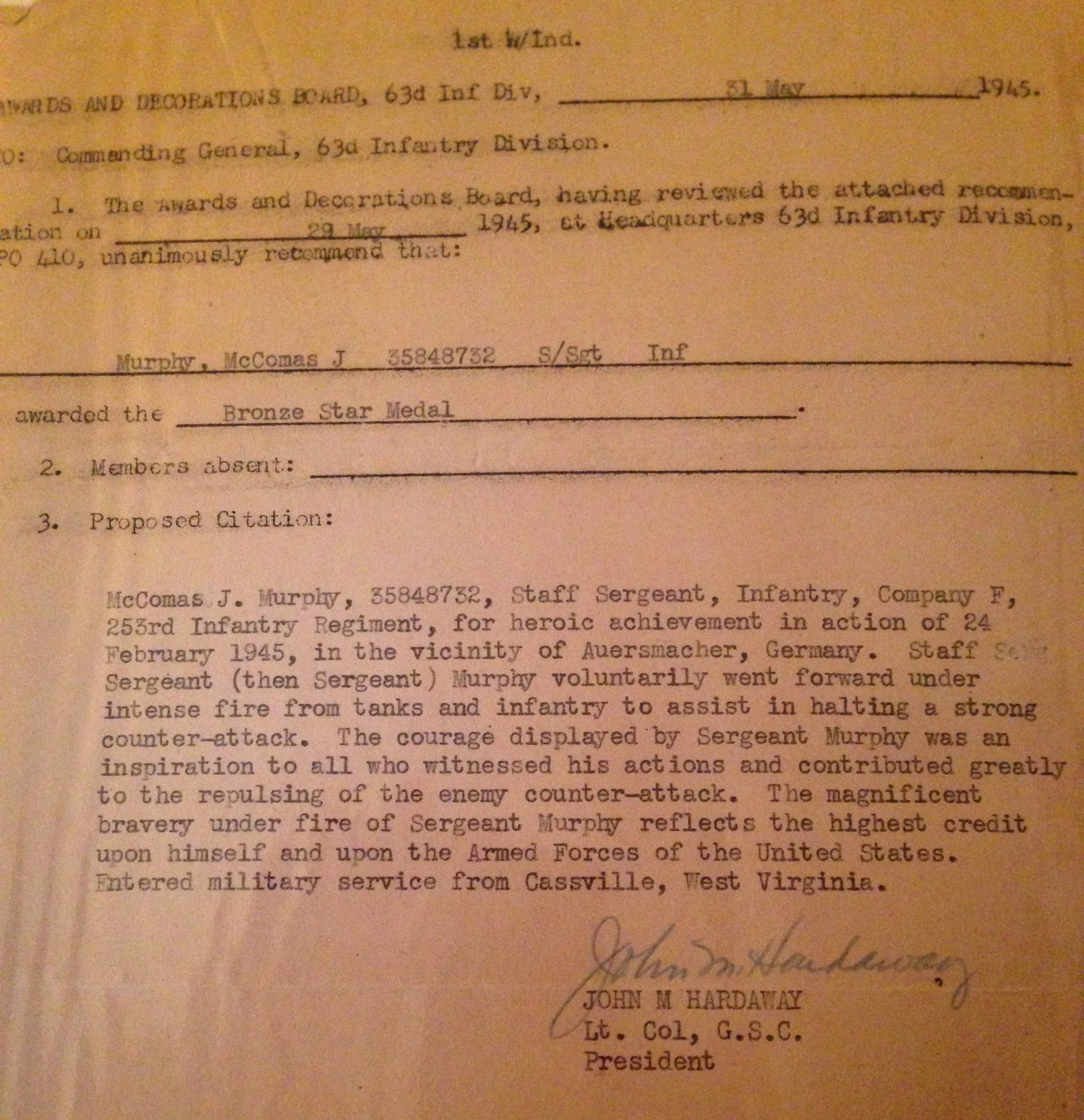 On Feb 24, 1945 Sgt. Murphy was serving as a Sgt. in 1st Platoon, Fox Company. The company was advancing in the woods near Auersmacher Germany when they were attacked by German infantry and a tank. The 1st platoons leader Lt. Francis J. Spiessbach and PFC Grover Dees attempted to halt the tank using a bazooka. Which did nothing to stop the tank other than anger it. Lt Spiessbach was wounded 3 times during this but still attempted to keep command and control of 1st Platoon. The company commander retreated from the battlefield resulting in a large amount of Fox company men to follow him in the retreat thinking that they were ordered to withdraw this action resulted in the Company Commander to be removed from the company that day. During this chaos the company called in field artillery fire on the tank but the artillery came in short and was landing on the men of Fox Company. Sgt. Murphy seeing everything possible going wrong knew he had to act. Sgt. Murphy went forward under the German and American artillery and he and other members of Fox Company were able to make the German tank and infantry withdraw. During this action Sgt. Murphy received a gunshot wound to top of head he was not hospitalized for a period over 24 hours.